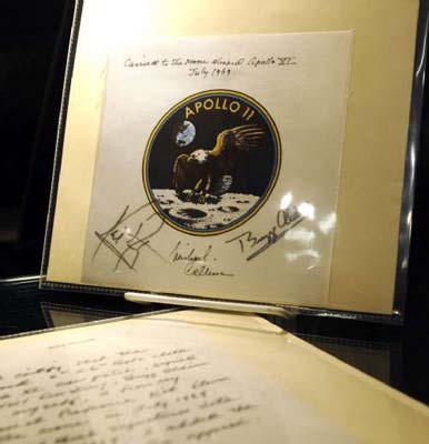 另一個(gè)驚喜是,一枚原來估價(jià)最高達(dá)三萬五千美元的“阿波羅十一號(hào)”徽章,竟以六萬一千美元售出。這枚徽章直徑長八點(diǎn)九厘米,上面印有一只在月球表面上空飛行的鷹。
