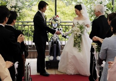 這款高約1.5米的機(jī)器人身體主要是白色,頭戴花環(huán),還有兩根塑料辮子。“她”的眼睛可以閃爍,也可以用她細(xì)細(xì)的嗓音說出“你可以揭開新娘的面紗了”之類的話語,主持起婚禮是有模有樣。
