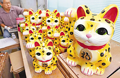 因日語中“豹”和“票”發(fā)音相同,原本“招財(cái)貓”的身體被圖上了豹子花紋!罢衅必垺泵恐欢加墒止ね可宵S色和黑色的顏料。據(jù)說制作這樣的一只至少需要4天,而上色一天只能完成20只。
