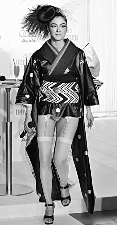 據(jù)香港《文匯報》報道,25歲的宮阪幾個月前在東京展示“改良版”戰(zhàn)衣。和服設(shè)計大膽,以黑皮革制造,上半身非常密實,但下半身的黑布帶一揭開,春光無限,不但露出桃紅色內(nèi)褲,還有同色絲襪和襪帶。