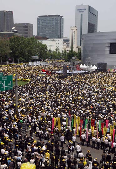警方估算,首爾廣場(chǎng)一帶云集了18萬名追悼者。大多數(shù)市民頭戴象征故人的黃色太陽帽,并手持黃色氣球追悼盧武鉉。