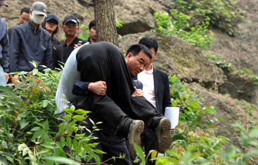 當(dāng)李某走到盧武鉉跳崖的落地點(diǎn)貓頭鷹巖下方時,他哭出了聲。李某跌坐在地,半天沒有回過神來。遺屬方面代表、前青瓦臺秘書室長文在寅在現(xiàn)場向李某等人詳細(xì)地詢問了發(fā)現(xiàn)盧武鉉的經(jīng)過。