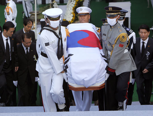 金大中遺屬李姬鎬女士等、韓國總統(tǒng)李明博和第一夫人金潤玉、前總統(tǒng)金泳三、憲法機(jī)關(guān)負(fù)責(zé)人、駐韓外交使節(jié)、各國代表及市民等歷史最大規(guī)模的3萬多人參加了當(dāng)天在國會(huì)前院舉行的遺體告別儀式。儀式持續(xù)約90分鐘。
