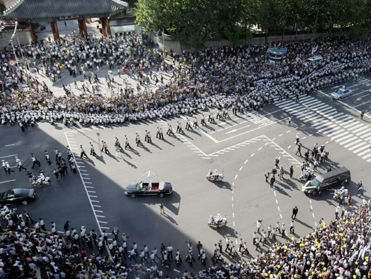 據(jù)報(bào)道,從遺體告別儀式舉行地到東橋洞私宅、首爾市廳前以及銅雀洞國立墓地的路上,云集數(shù)十萬人,送金大中最后一程。
