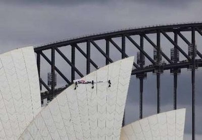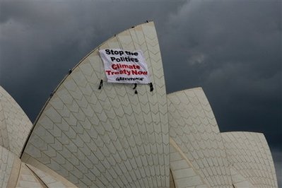 據(jù)報(bào)道,在哥本哈根召開的氣候峰會上,發(fā)達(dá)國家和發(fā)展中國家兩大陣營之間仍在僵持,各界對峰會結(jié)果的悲觀情緒彌漫會場。15日,5名綠色和平組織成員抓著繩索爬上了悉尼歌劇院,并拉開一個100平米大的條幅,上面寫著“不要再玩政治——立刻達(dá)成氣候協(xié)議”。事后,這5人被警方逮捕。
