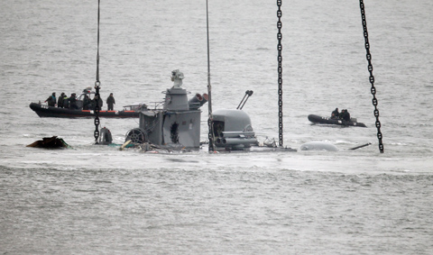 海軍方面的一位有關(guān)負(fù)責(zé)人表示:“風(fēng)浪很大,再加上出現(xiàn)‘漲潮’現(xiàn)象,水流速度非?,因此周末之前很難完成打撈作業(yè)。”負(fù)責(zé)打撈作業(yè)的民間企業(yè)的一位有關(guān)負(fù)責(zé)人表示:“如果現(xiàn)在繼續(xù)進(jìn)行打撈作業(yè),鐵鏈可能會破入船體的脆弱部分。能承受鐵鏈力量的船體耐用材料已經(jīng)流失!