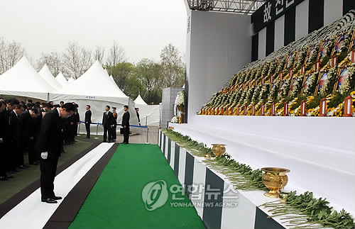 中新網(wǎng)4月26日電 據(jù)韓聯(lián)社報道,韓國總統(tǒng)李明博26日上午訪問設(shè)在首爾廣場的“天安”艦吊唁所,吊唁犧牲官兵。當(dāng)天韓國總統(tǒng)府青瓦臺秘書等行政人員陪同李明博前來吊唁。