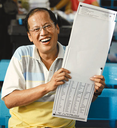 中新網5月11日電 據(jù)香港《文匯報》報道,菲律賓10日大選,選舉委員會表示,在已點算的57%選票中,已故前總統(tǒng)阿基諾夫人的兒子阿基諾三世取得40.58%選票,其勁敵73歲前總統(tǒng)埃斯特拉達只得25.72%。阿基諾三世有望繼亡母后,成為家族中第2名總統(tǒng),他承諾當選后致力打擊腐敗和消除貧困。