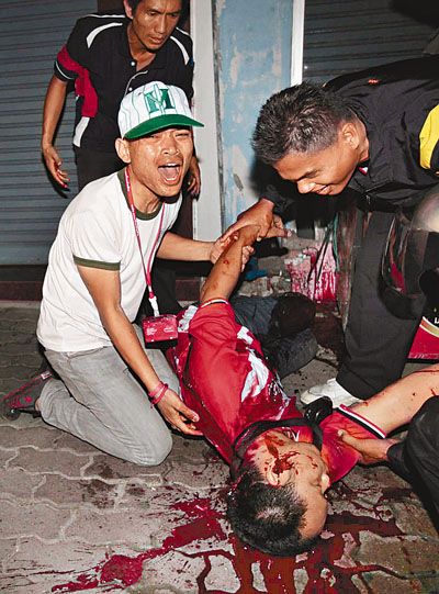 納塔武對記者說:“阿披實已為內(nèi)戰(zhàn)揭開序幕了。我們緊急要求政府撤軍,停止一切暴力行為。如果阿披實不同意停火,我不知道我們能否活過今晚。我們希望阿披實不想要戰(zhàn)爭!