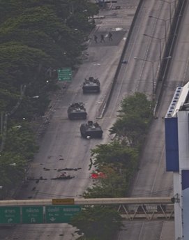 中新網5月19日電 據外電報道,大批泰國士兵和軍車18日向紅衫軍在曼谷商業(yè)區(qū)內的大本營聚集,規(guī)模空前。