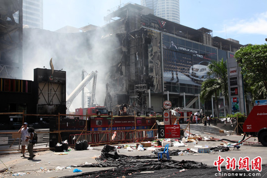 離此咫尺之遙的便是曾被曼谷人引以為豪、號(hào)稱亞洲第二大的森特沃購(gòu)物中心,19日下午被人放火燃燒。記者在現(xiàn)場(chǎng)看到,該樓的部分建筑已經(jīng)垮塌,三支高壓水龍正對(duì)著垮塌處噴水。據(jù)稱,當(dāng)天搜救人員從廢墟中發(fā)現(xiàn)一年齡大約35歲男子的尸體。官方初步估計(jì),曼谷19日晚至20日晨火災(zāi)造成的損失或達(dá)數(shù)十億美元。