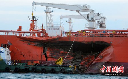 馬來西亞海事執(zhí)法局表示,載有6.2萬噸原油的油輪左舷艙被劃出一道10米長的裂縫,已被拖往樟宜港維修,而肇事貨輪仍停泊在撞船現(xiàn)場。撞船地點位處繁忙的商業(yè)航道。新加坡是全球最繁忙的港口之一,亦是亞洲的石油貿(mào)易中心。