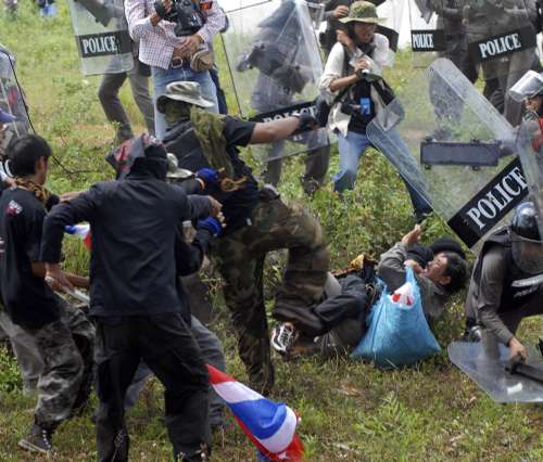 由于當?shù)鼐用癫粷M黃衫軍在當?shù)厥就,村民擔心會影響國家聲譽和柬埔寨的關系,因此村民在通往柏威夏寺的路上搭起路障,防暴警察也全副武裝,防止示威者通過。電視片段所見,黃衫軍多次揮動長棒,與防暴警察和試圖阻止他們進入柏威夏寺一帶的村民發(fā)生沖突(見圖)。省政府官員表示有數(shù)十人在騷亂中受傷,其中二十人要送院治理,一名送院者頸部受到槍擊。事件最后在警方調(diào)解下解決。