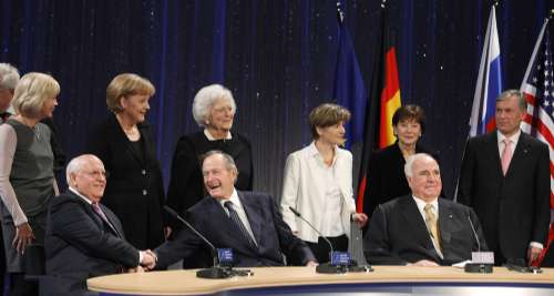 紀(jì)念活動(dòng)主辦方贊揚(yáng)老布什與戈?duì)柊蛦谭蚍秩蚊捞K領(lǐng)袖時(shí),對(duì)拆除柏林墻及促成兩德統(tǒng)一的貢獻(xiàn),還贊揚(yáng)德國(guó)前總理科爾“抓住關(guān)鍵的一刻”,促成德國(guó)統(tǒng)一。