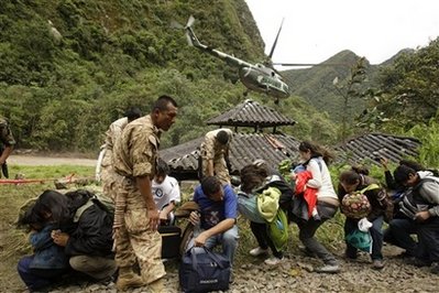 據(jù)悉秘魯當(dāng)局出動(dòng)了6架直升機(jī),美國(guó)方面也派出6架直升機(jī)前往洪水泛濫的馬丘比丘遺址幫助救援。對(duì)于有人士質(zhì)疑美國(guó)派出直升機(jī)前往秘魯?shù)膭?dòng)機(jī),美國(guó)駐秘魯大使麥克金利(Michael McKinley)強(qiáng)調(diào)說,此次救援行動(dòng)美國(guó)只是擔(dān)任救助游客的角色,而不是前往干涉或占領(lǐng)。