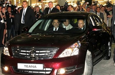 中新網(wǎng)6月3日電 日本日產(chǎn)公司在圣彼得堡設(shè)立的新工廠向參加工廠開幕式的來賓展示了該廠生產(chǎn)的日產(chǎn)天籟(Nissan Teana)車。俄羅斯總理普京2日坐到這輛車的駕駛員位置上,開車帶該廠廠長兜了一圈。