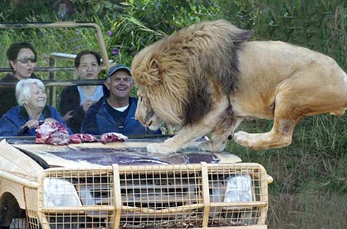 園方巧妙設(shè)置的吉普車,強化玻璃恰好就在擋風玻璃處隔開籠內(nèi)與籠外,工作人員還在引擎蓋上放生肉吸引獅子跳上來,也讓游客能近距離觀賞。獅子大塊咬肉的模樣真夠嚇人,不少游客坐在車中都覺得自己彷佛就要成為猛獅的點心了。