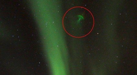 在一張他于1月21日拍攝的照片中,右上方有一個(gè)像綠色水母,又像降落傘的奇怪物體。米凱森描述說,“這個(gè)物體影像具有跟北極光相同的綠色。這意味著北極光是造成這個(gè)物體成影的光源!