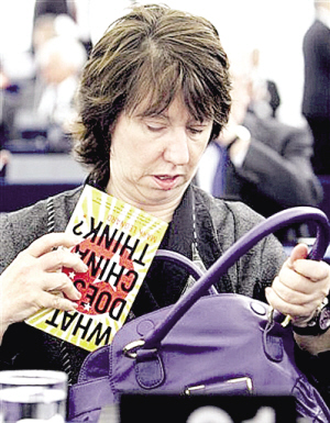 當(dāng)?shù)貢r(shí)間9日,歐盟女外長(zhǎng)阿什頓出席歐洲議會(huì),入場(chǎng)坐定后,就從包里掏出一本名為《中國(guó)怎么想》的書,這一瞬間剛好被美聯(lián)社記者的快門捕捉下來(lái)。