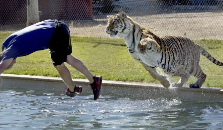 游戲一直很安全地進行。一只老虎的體重可達到47英石(約300公斤重),但嬉戲時它不會伸出爪子去抓人。泳池里也總是有2名管理員隨時關(guān)注情況,不讓樂趣變成悲劇。