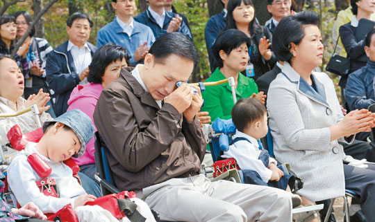 當(dāng)聽(tīng)到連發(fā)音都不甚標(biāo)準(zhǔn)的殘疾人兒童認(rèn)真的歌唱,金潤(rùn)玉女士馬上流下了眼淚,李明博總統(tǒng)最后也忍不住落下了淚水。