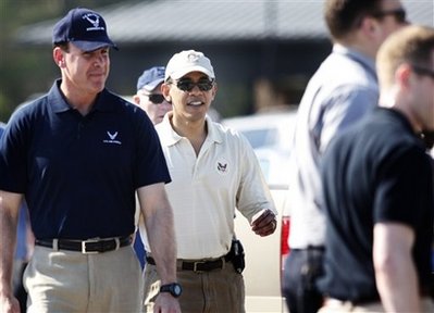 奧巴馬是在攝氏30多度的氣溫下打球的,陪同他的有美國商務部長等多位高官。美國前總統(tǒng)克林頓等人都喜歡在這個空軍基地打球。
