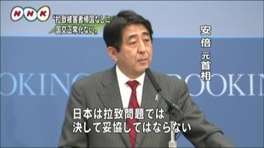 據(jù)日本NHK電視臺(tái)18日?qǐng)?bào)道,日本前首相安倍晉三在美國(guó)華盛頓演講時(shí)明確指出,關(guān)于人質(zhì)綁架問(wèn)題日本絕對(duì)不會(huì)就此妥協(xié)。只要享有人權(quán)的被綁架者歸國(guó)無(wú)法實(shí)現(xiàn),日本不會(huì)同朝鮮恢復(fù)邦交正常化,而朝鮮跨越日本領(lǐng)土發(fā)射導(dǎo)彈的挑釁行為絕對(duì)無(wú)法容忍。