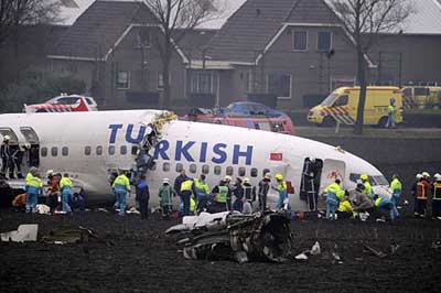 有現(xiàn)場(chǎng)目擊者稱(chēng),飛機(jī)在機(jī)場(chǎng)跑到附近的泥濘地墜毀,機(jī)身斷為三截,機(jī)尾、引擎與機(jī)身脫離。但慶幸的是,飛機(jī)未發(fā)生爆炸,也未起火。荷蘭官員稱(chēng)此次空難造成傷亡人數(shù)如此至少實(shí)為“奇跡”。