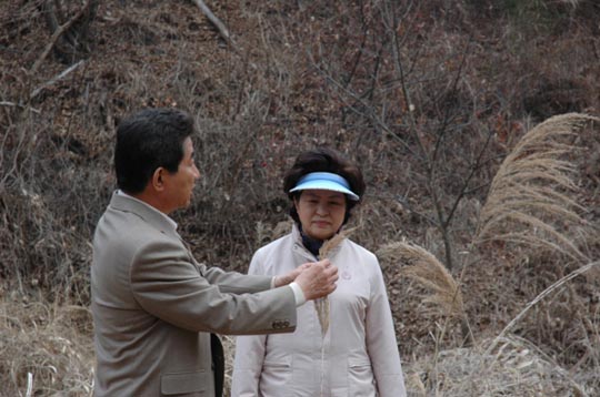 2008年3月13日,盧武鉉在私宅附近田間散步時(shí),向夫人權(quán)良淑女士講解關(guān)于一些植物的情況。