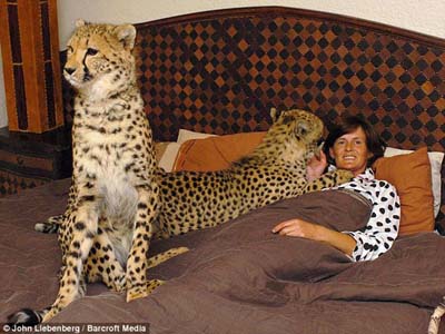 中新網7月3日電 據英國媒體報道,南非一名46歲女子在家中養(yǎng)了4只印度豹、5只獅子和2只老虎,她與它們同吃同住親密無間,甚至晚上睡覺時也同這些伙伴躺在一張床上。