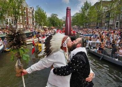 中新網(wǎng)8月4日電 荷蘭阿姆斯特丹市長科恩8月1日為五對(duì)同性戀人主持婚禮,掀起該市支持同性戀者年度水上大游行的高潮。