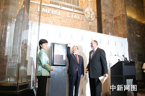 中新社紐約九月三十日電(記者 魏晞)九月三十日,紐約地標性建筑“帝國大廈”舉行隆重的“亮燈儀式”:高高矗立在曼哈頓中城的帝國大廈大樓頂端,當晚將亮起代表中國的“紅黃紅”三層雙色彩燈,整個紐約的夜空都將因此變成“中國色彩”,這也是帝國大廈首次為了中國國慶亮燈。