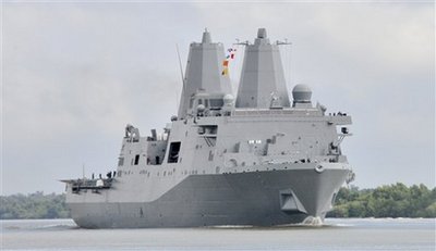 這艘軍艦是美國圣安東尼奧級船塢登陸艦的第六艘,全長二百零八米,船員二百九十名。來自世貿(mào)中心的鋼材于被用于制造“紐約號”上的兩棲登陸平臺,“它可以讓一支七百人的海軍陸戰(zhàn)隊在任何地方登陸”,美國海軍少校柯蒂斯·瓊斯說。目前“紐約號”的主要任務(wù),正是將美國海軍部署到反恐行動現(xiàn)場。