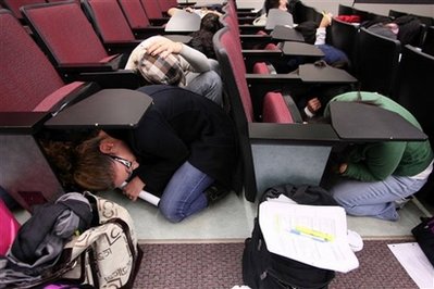 在舊金山南面的圣荷西市的科技博物館內(nèi),學(xué)生們在這里進(jìn)行模擬演習(xí)。他們在晃動(dòng)的車廂里,不斷落下物品的教室里,按照工作人員的口令趴下、鉆到椅子或課桌下,并設(shè)法將自己固定,一直等到搖晃停止。