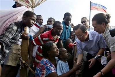 聯(lián)合國(guó)秘書長(zhǎng)潘基文一行17日在海地了解地震造成的損失并掌握了第一手的災(zāi)情資料。面對(duì)嚴(yán)峻的救援情況,日漸絕望的海地災(zāi)民,在被問到是否有足夠的救援物資滿足數(shù)以百萬(wàn)計(jì)的災(zāi)民時(shí),潘基文說:“我真心希望并呼吁海地人民要更加耐心”,他還表示不希望看到發(fā)生騷亂。