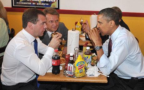 據(jù)美國媒體披露,奧巴馬點了一份傳統(tǒng)的起司漢堡和一瓶紅茶,梅德韋杰夫也點了一份起司漢堡和一瓶可樂,不過他在漢堡中加了一點墨西哥辣椒、蘑菇和洋蔥,兩人還分享一份薯條。兩位總統(tǒng)都脫去西裝,身著白色襯衫,奧巴馬習(xí)慣性地卷起袖子,擺出一副大快朵頤的樣子;梅德韋杰夫則保持俄式紳士的風(fēng)度,沒有卷起袖子。兩人相向而坐,一邊啃漢堡,一邊借助旁邊的翻譯“談笑風(fēng)生”。