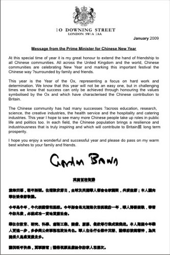 中新網(wǎng)1月24日電 據(jù)“中央社”報(bào)道,23日,英國首相布朗向華人拜年,誠摰祝福大家新的一年心想事成,順利成功,并希望新的一年有更多華人參政。