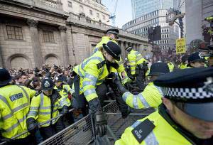 目前,有1200名示威者聚集在英格蘭銀行門(mén)口,進(jìn)行抗議活動(dòng)。為了防止更多的示威者接近央行,警察不得不動(dòng)用大量防暴車輛將附近的道路團(tuán)團(tuán)圍住。而在倫敦西德尼德街與巴塞洛繆巷的交界處,眾多蒙面男子試圖闖過(guò)警察的封鎖線來(lái)進(jìn)行抗議活動(dòng),遭到了警察的圍堵。這些蒙面男子則向警察投擲空易拉罐、水果和面粉。目前至少有一名警察的額頭被打破。面對(duì)警方派出的增援部隊(duì),蒙面男子們大喊著“混蛋警察”、“這是我們的街道”等口號(hào)。就在警方維持秩序的同時(shí),抗議隊(duì)伍的前排有一位示威者的額頭也被打破。而一位身著黑衣、戴著面具的男子則手持著一根木棒,試圖上前毆打警察。一位警官因被擊中被帶到僻靜處進(jìn)行治療。