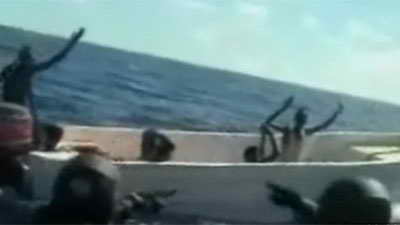 據(jù)英國(guó)媒體報(bào)道,5月4日,法國(guó)海軍將抓獲11名索馬里海盜的錄像公布于眾。法國(guó)海軍在塞舌爾島以外海域俘虜11名索馬里海盜。當(dāng)時(shí),這些海盜蔣法國(guó)軍艦誤認(rèn)為是商船。據(jù)報(bào)道,事實(shí)上,海盜們想襲擊的是參與歐盟打擊海盜行動(dòng)、在當(dāng)?shù)睾S蜓策壍姆▏?guó)導(dǎo)彈護(hù)衛(wèi)艦“雪月號(hào)”。
