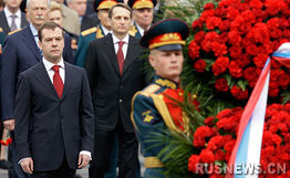 梅德韋杰夫在亞歷山大花園克里姆林宮紅墻下向無名烈士墓敬獻(xiàn)了花圈。俄羅斯總理普京、各部委代表、衛(wèi)國(guó)戰(zhàn)爭(zhēng)老戰(zhàn)士都參加了敬獻(xiàn)花圈儀式。