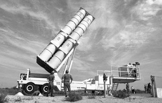 7日,以空軍先是在地中海上空用F-15戰(zhàn)機發(fā)射了一枚“藍雀”導彈,用來模擬伊朗“流星-3”彈道導彈,特拉維夫南部的帕爾瑪希姆空軍基地的“箭”式-2型反導系統(tǒng)隨即作出反應,成功阻截這枚導彈。此次測試是以色列空軍和美國導彈防御局聯(lián)合進行的。以國防部長巴拉克坐在一架直升機上觀看了這次測試。