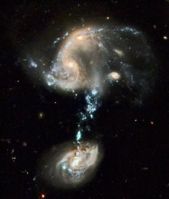 被稱作Arp 194的星系群,圖片中出現(xiàn)的明亮的藍(lán)色彩帶,其實(shí)是新生藍(lán)色恒星向外延伸的完整的螺旋臂。當(dāng)兩個(gè)星系利用引力相互作用時(shí),就會出現(xiàn)這種現(xiàn)象。