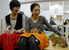 中新網(wǎng)1月6日電 可以讓顧客和兔子親密接觸的“兔兔咖啡館”去年7月在日本名古屋東區(qū)開張,除了帶孩子的父母和女性客人以外,許多下班回家的公司職員也經(jīng)常光顧,生意非常興隆。該店“園長(zhǎng)”倉田直基(36歲)說:“兔子有著心靈治療的神奇力量。人們都喜歡和它們接觸,獲得內(nèi)心的平和!