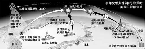 此外,韓國軍方預(yù)測,朝鮮如果發(fā)射能夠威脅美國本土的大浦洞2號改良型導(dǎo)彈,美國將分兩個階段予以攔截。大浦洞2號導(dǎo)彈發(fā)射后,朝鮮半島上空的美國紅外線預(yù)警衛(wèi)星(DSP)將首先發(fā)現(xiàn)情況。導(dǎo)彈尾部的火焰在太空中也能得到確認(rèn)。預(yù)警衛(wèi)星將向美國的所有導(dǎo)彈防御體系發(fā)送警報。導(dǎo)彈升空后,第一階段的攔截體系開始運(yùn)作。位于東海的美國海軍宙斯盾艦將通過相控陣?yán)走_(dá)實(shí)時預(yù)測導(dǎo)彈的軌跡。如果大浦洞2號導(dǎo)彈接近日本列島,宙斯盾艦將發(fā)射SM-3導(dǎo)彈進(jìn)行攔截。美國第7艦隊(duì)擁有夏洛號巡洋艦(CG-67)和斯特塞姆號驅(qū)逐艦(DDG-63)等九艘宙斯盾艦,一次可以發(fā)射多枚SM-3導(dǎo)彈。盡管日本海上自衛(wèi)隊(duì)的宙斯盾艦上也裝備有SM-3導(dǎo)彈,但是由于日本的和平憲法禁止自衛(wèi)隊(duì)在日本境外使用武器,所以在攔截導(dǎo)彈問題上受到了限制。