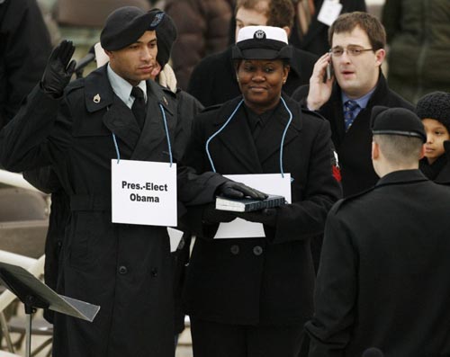 隨著軍樂隊(duì)高奏總統(tǒng)官方進(jìn)行曲《向統(tǒng)帥致敬》,這場大規(guī)模的彩排在黎明之前開始。據(jù)悉,交接儀式將在國會大樓西側(cè)的露天平臺上進(jìn)行。所有的重要人物,包括奧巴馬一家和布什,都有替身扮演。其中,扮演奧巴馬夫婦的是兩名黑人士兵,扮演他們“女兒”的則是兩個(gè)黑人小姑娘。除參加交接儀式彩排外,他們還進(jìn)行了車隊(duì)走位的彩排。