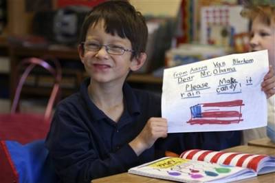 即使不是現(xiàn)實的復(fù)雜議題,小孩異想天開的古怪愿望,奧巴馬要實行起來亦不容易。7歲的阿龍就寫道:“請令天空下糖果雨!”另有兒童希望奧巴馬讓全球兒童放假一天,又有兒童畫了一個地球,命名為“奧巴馬樂園”。