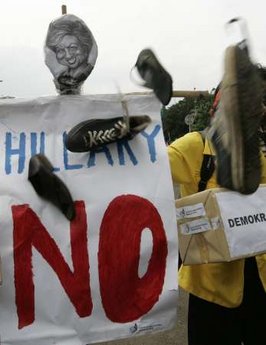 中新網(wǎng)2月20日電 美國國務卿希拉里亞洲之行18日到訪第二站印度尼西亞首都雅加達。由于前總統(tǒng)布什與穆斯林關系交惡,希拉里人還沒抵達雅加達,當?shù)氐拿绹笫桂^外就爆發(fā)激烈抗議,抗議民眾還以丟鞋子的方式,不歡迎希拉里來訪。