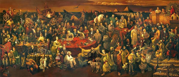 這幅油畫長6米、高2.6米,繪有103位世界名人,中國的萬里長城、埃及的金字塔、英國的巨石陣等地標作為背景出現(xiàn)在油畫中。
