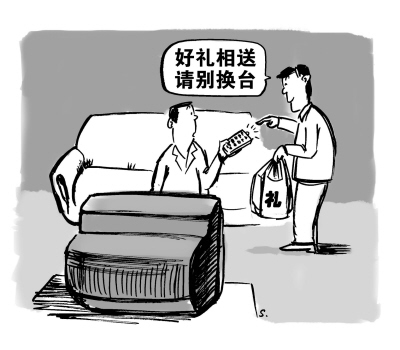我選了“收買”條件最好的一家衛(wèi)視臺節(jié)目,每天一開電視,就鎖定這家頻道,堅持了起碼大半年。本來,家里最喜歡看本地電視臺,可人家電視臺禮金高,收了人家的錢,拿了人家的禮,我也要負責任的。再說了,現在電視臺節(jié)目也差不多,一個電視劇幾家同時播,看哪臺不都差不多?而且,人家的節(jié)目也不錯。