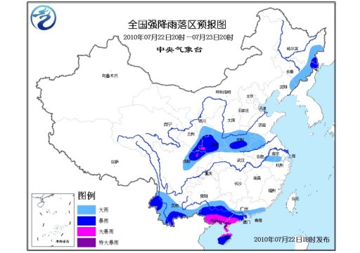 中新網(wǎng)7月22日電 據(jù)中央氣象臺網(wǎng)站消息,中央氣象臺7月22日18時繼續(xù)發(fā)布暴雨黃色預(yù)警:預(yù)計,7月22日20時到7月23日20時,廣東沿海和西南部、廣西大部、海南、云南西部和南部、四川盆地西部、甘肅東部、陜西中南部、湖北西北部、河南大部、安徽北部和東南部、浙江西北部以及黑龍江東南部、吉林東部、遼寧東北部等地有大雨或暴雨,其中,廣東西南部、廣西南部、海南北部的部分地區(qū)有大暴雨或特大暴雨;四川盆地西北部、陜西西南部的局部地區(qū)有大暴雨;上述地區(qū)局地并伴有短時雷雨大風(fēng)等強對流天氣。